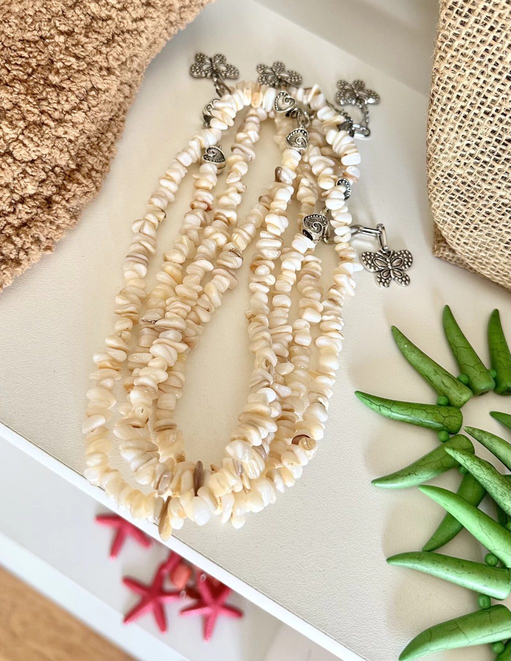 COLLAR 100% HECHO A MANO, ENHEBRADO CON ESCALLAS DE NÁCAR IRREGULAR . LARGO DEL COLLAR : 43 CM + EXTENSIÓN REGULABLE DE 5 CM CON MINI DIJE PLATEADO EN TERMINAL.