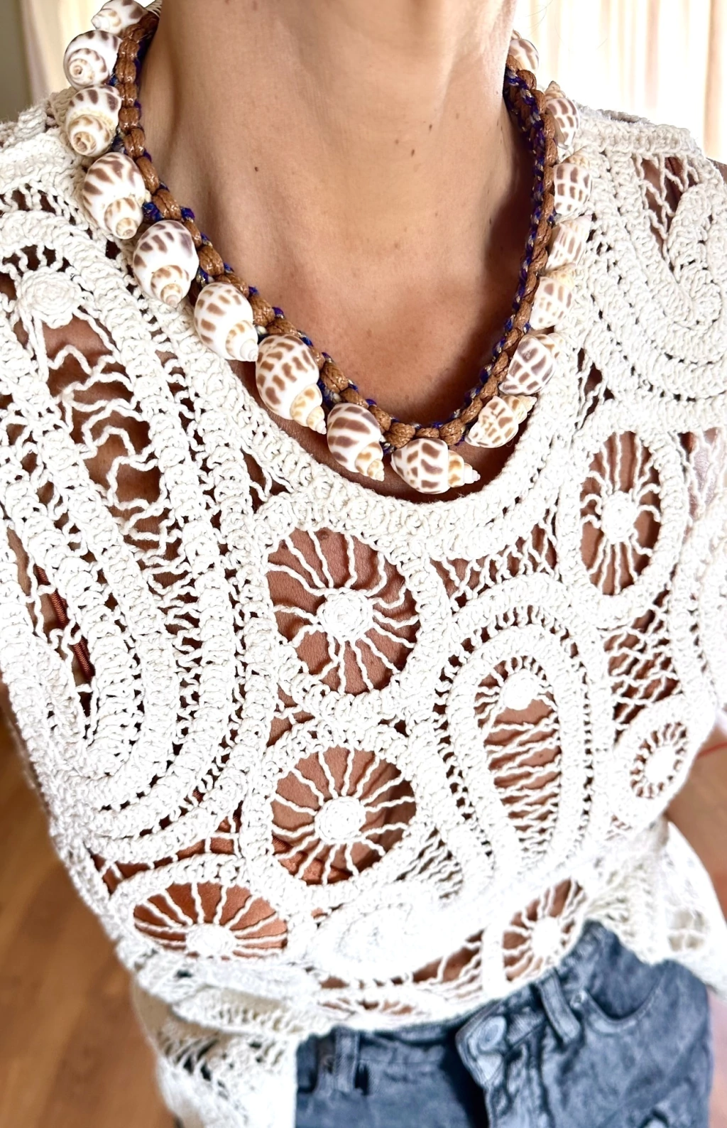 COLLAR 100% TEJIDO A MANO (CON HILOS ENCERADOS + HILOS DE ALGODÓN CON LUREX) EN PUNTO MACRAMÉ (CRUDO-CHOCOLATE-AZUL) + CARACOLES TEXTURADOS SOBRE TODO EL TEJIDO . LARGO DEL COLLAR 41 CM + EXTENSIÓN REGULABLE DE 3 Y MINI DIJE PALMERITA EN TERMINAL.