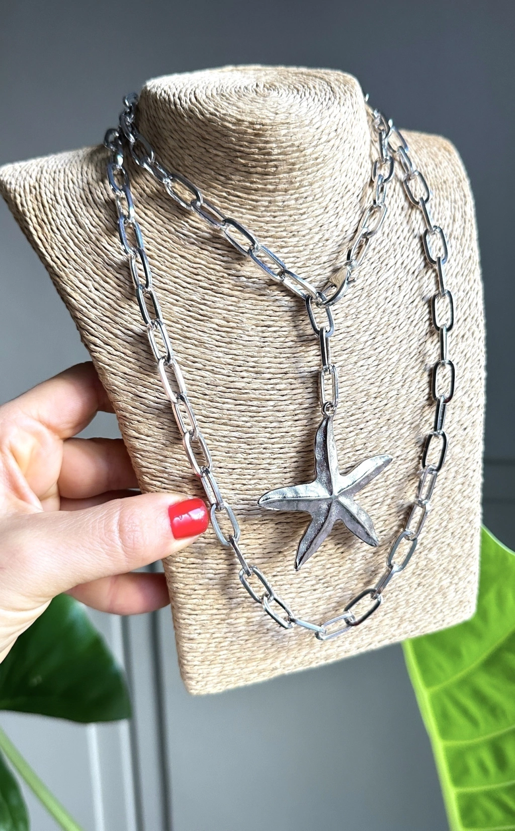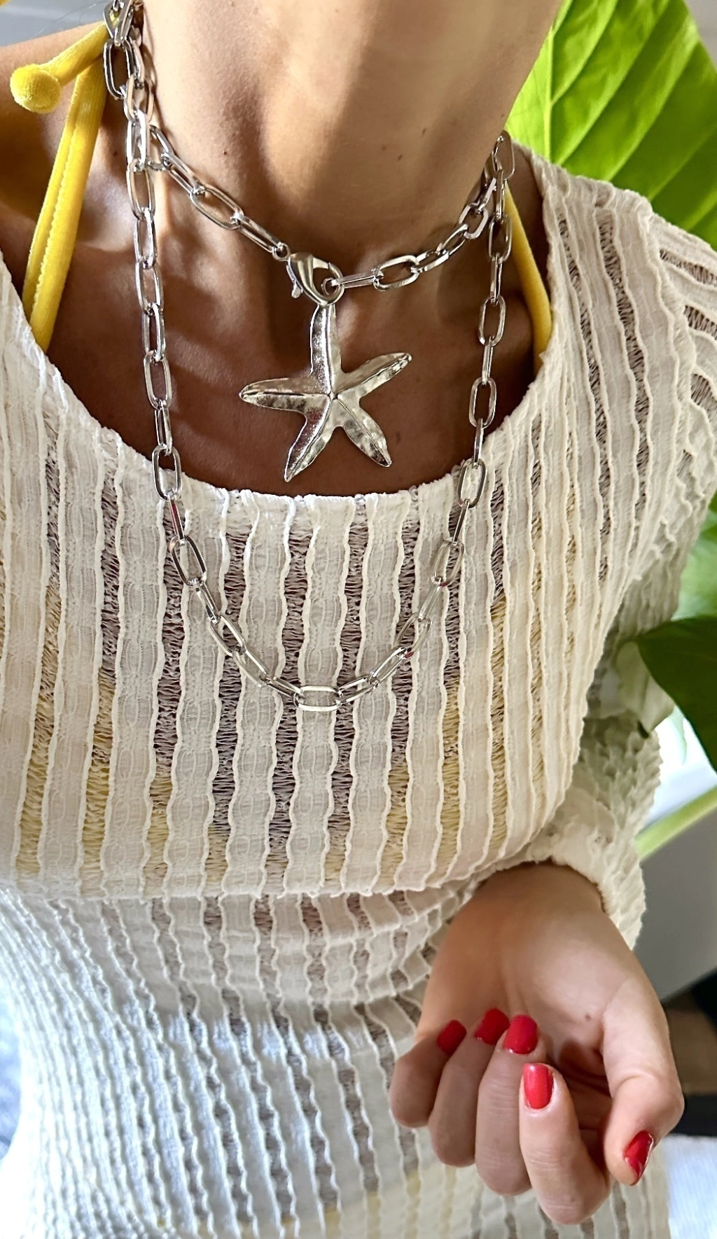 COLLAR DE CADENA NET DE ALUMINIO PLATEADA NÍQUEL DE 90 CM DE LARGO + GANCHO MOSQUETON PETITE + ESTRELLA DE MAR PLATEADA TEXTURADA DE 5 CM X 5 CM. PODÉS USARLO DOBLE, REGULANDO LAS ALTURAS, ELIGIENDO SI USAR EL DIJE CERCA DEL CUELLO O HACIA EL PECHO.